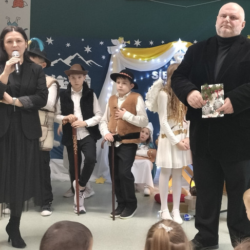 20 grudnia odbyła się w naszej szkole akademia z okazji Świąt Bożego Narodzenia, którą rozpoczęły pięknym tańcem „Walczykiem gwiazdeczek” dzieci z oddziałów przedszkolnych. Następnie uczniowie z klasy pierwszej przedstawili „Jasełka”, wprowadzając wszystkich zgromadzonych w świąteczny nastrój. Nasi mali aktorzy wspaniale odegrali swoje role, przypominając o istocie Bożego Narodzenia. Byli aniołowie, pastuszkowie, Trzej Królowie oraz Święta Rodzina, a całość dopełniły piękne kolędy, tańce i stroje. W dalszej części uroczystości na scenie pojawili się kolędnicy - uczniowie z klasy czwartej, którzy kultywując piękną polską tradycję wesoło zakolędowali i złożyli wszystkim życzenia świąteczne. Nie mogło zabraknąć wspólnego śpiewania kolęd, uśmiechów oraz serdeczności. Cała społeczność szkolna przy zapalonych świecach, tworzących magiczny nastrój razem zaśpiewała pastorałkę i wysłuchała fragmentu Ewangelii. Następnie przedstawiciele Samorządu Uczniowskiego złożyli życzenia i podzielili się w imieniu wszystkich uczniów opłatkiem z Dyrekcją szkoły. Na zakończenie uroczystości głos zabrali Dyrektor szkoły Witold Wyskiel oraz Wicedyrektor Anna Tomkowicz, którzy dołączyli się do życzeń i podziękowali występującym za przygotowanie programu artystycznego. Po akademii uczniowie udali się na spotkania opłatkowe do swoich klas.